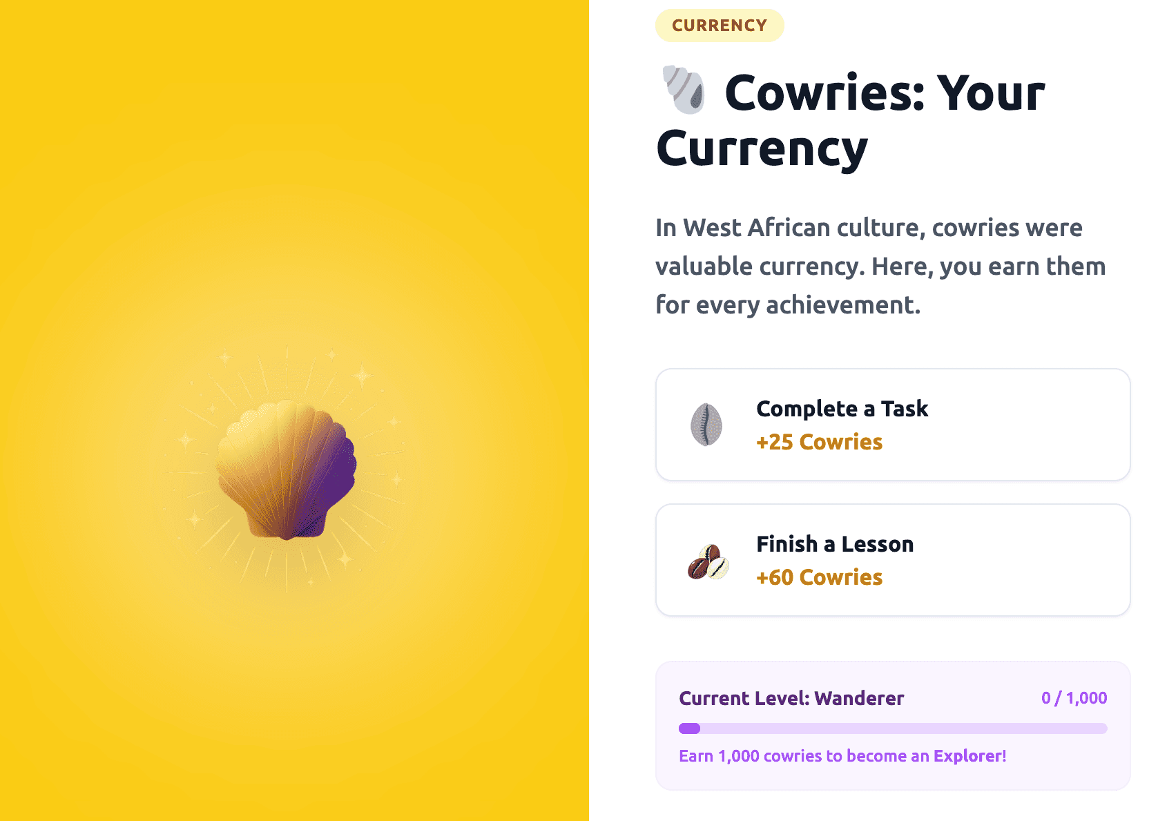 - Earn While You Learn: Need motivation? We’ve introduced Cowries—our unique digital currency inspired by African history. Complete a lesson? Earn Cowries. Ace a quiz on Ga greetings? Earn more Cowries. You can track your wealth alongside your knowledge!